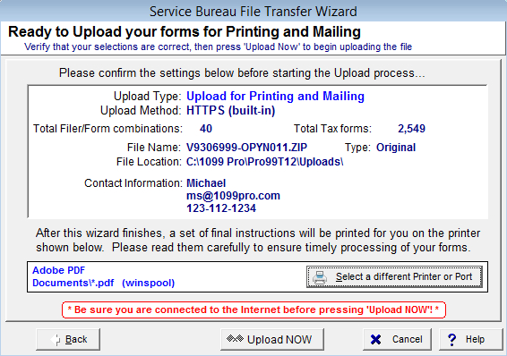 Continue to the Submit a Service Bureau Upload screen and follow prompts. View Control Totals Report to carefully verify selected services and box-by-box totals for the forms and filers in your upload. Most users select Built-in HTTPS secure transfer method. Enter your Digital Signature to authorize the processing of this upload. Then click "Upload My File" (your encrypted data files and signed Control Totals are digitally transmitted to us - there is no need to phone, email, or fax the Service Bureau).